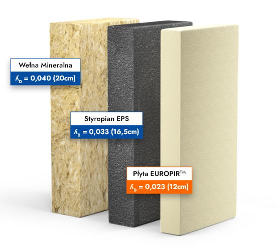 EUROPIR® boards are distinguished by their very low declared thermal conductivity coefficient (ʎd).This characteristic makes it possible to achieve the legally required heat transfer coefficient (U) of a building envelope with a significantly smaller layer of insulation EN